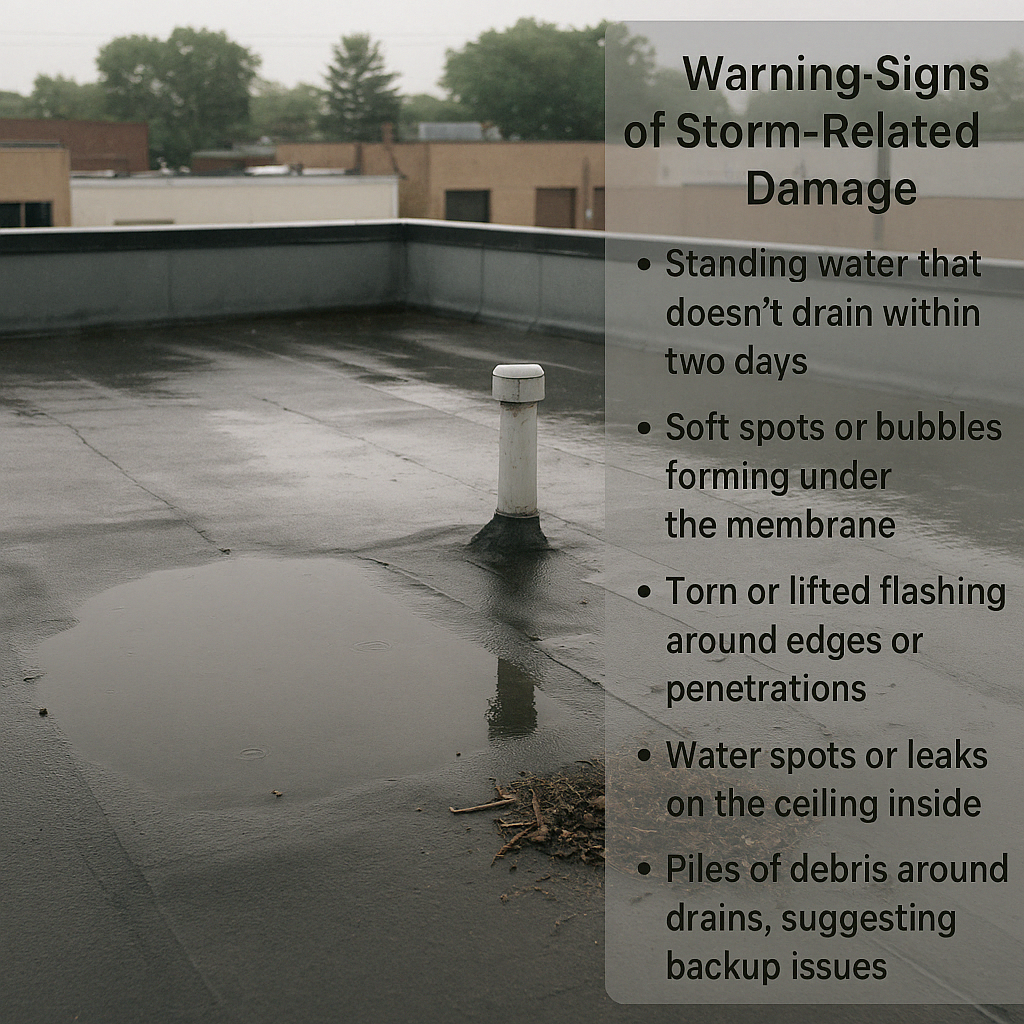 Flat roofs are more prone to storm-related damage due to their shape and drainage limitations. Here are the most common risks during Indiana’s storm seasons: